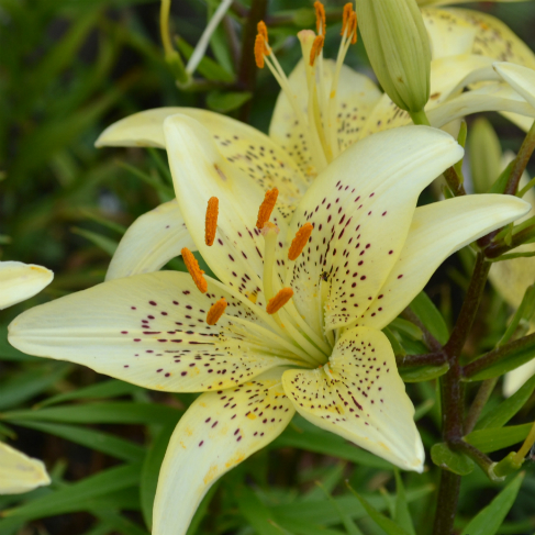 Высота растения около 100 см. Листья узколанцетные, 11-14 см длиной и 1,3-1,5 см шириной. Цветки (до 21 шт.) направлены вверх. Соцветие коротко-пирамидальное, плотное, часто сложное. Околоцветник звездчатый, светло-желтый с более светлыми, узкими верхушками листочков околоцветника и немногочисленным бордовым крапом в оранжеватом центре, 13-14 см в диаметре. Тычиночные нити бледно-желтые. Пыльца оранжевая. Нектарники закрытые. Цветет с третьей декады июля.