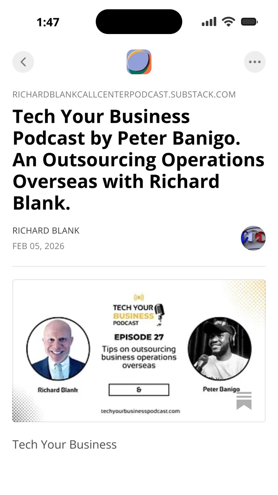 Tech Your Business Podcast by Peter Banigo. An Outsourcing Operations Overseas with Richard Blank. (